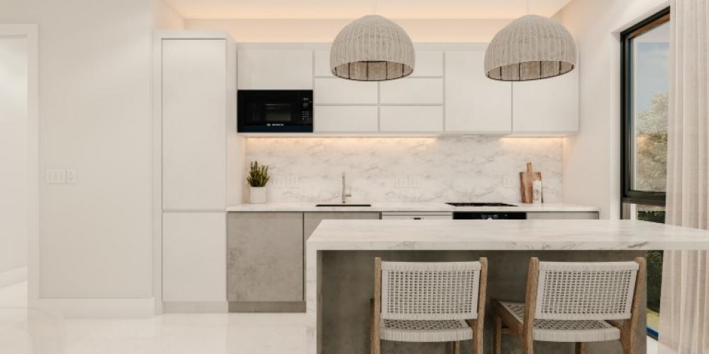 Each apartment is conceived for effortless indoor–outdoor living, with open-plan interiors flowing onto generous terraces ideal for al fresco dining or sunset unwinding. Italian-designed kitchens with quartz countertops and premium German appliances anchor the living spaces, while air-conditioned bedrooms feature bespoke hardwood wardrobes and calming, contemporary finishes. Select ground-floor residences benefit from private garden spaces, enhancing privacy and lifestyle appeal.
