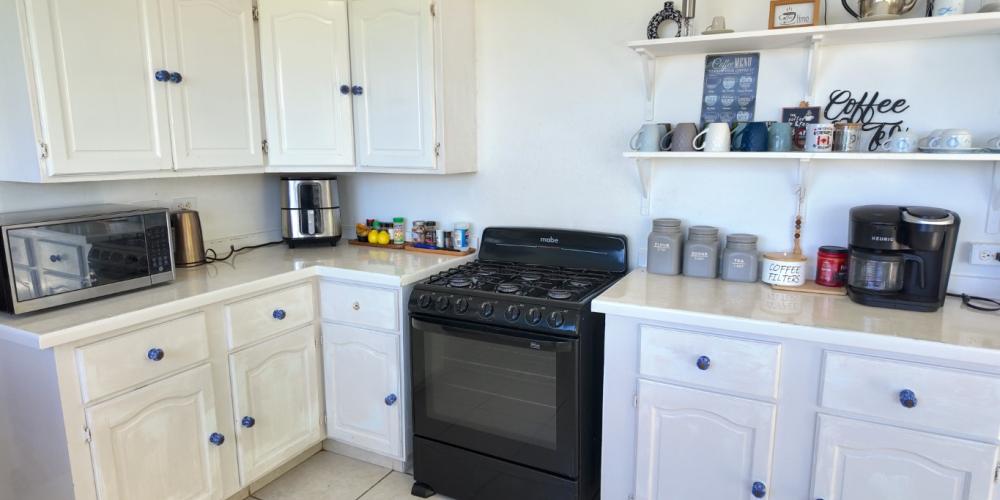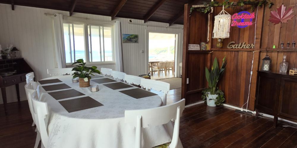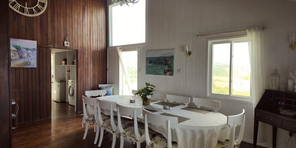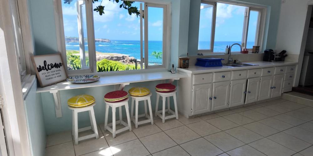 The gourmet kitchen, complete with air-conditioning, modern appliances, and a charming breakfast nook, enjoys captivating views of both the ocean and the lush countryside. Adjacent to the kitchen lies a well-sized storage room and a functional laundry area with washer and dryer for added convenience.