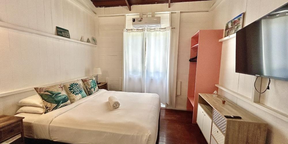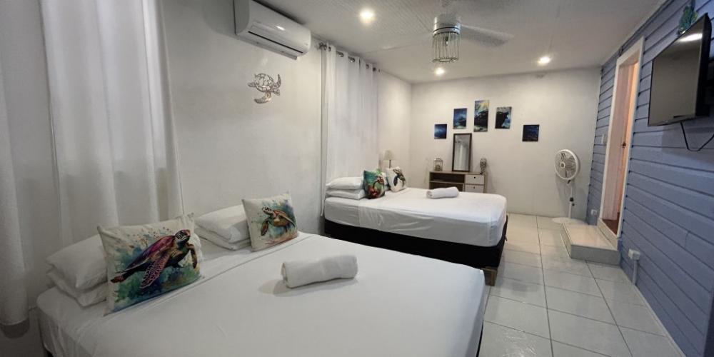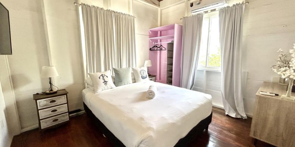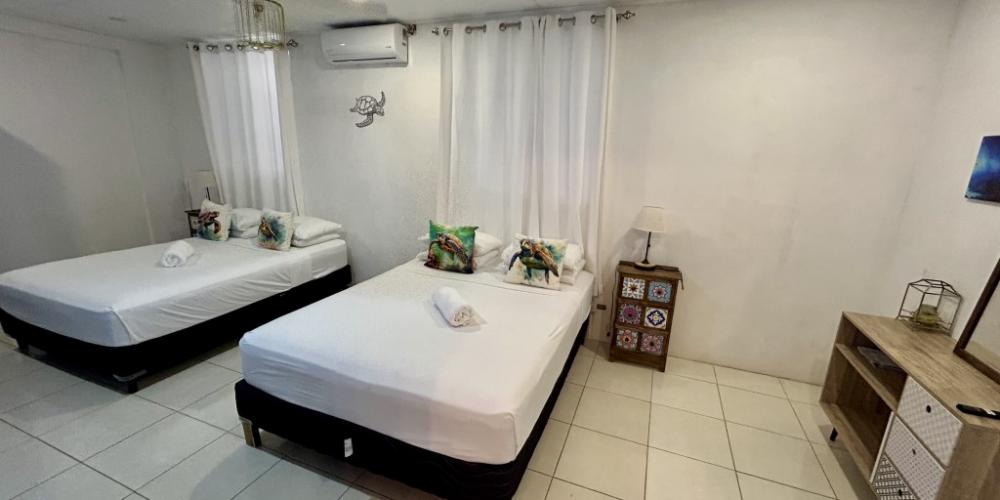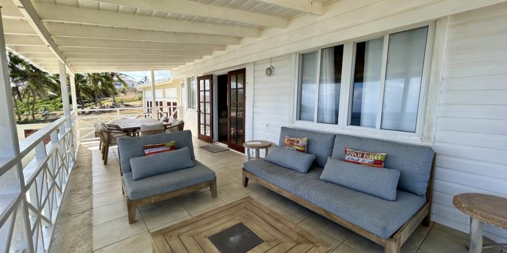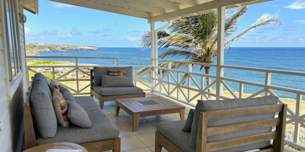 The entryway welcomes you with a light-filled foyer, where the first guest bedroom with twin beds and a fully renovated bathroom sits conveniently nearby. Beyond, an expansive open-plan living and dining area with a stylish mini-bar, flows seamlessly onto the grand oceanfront terrace. Here, French doors frame sweeping sea views and open to the infinity-edge pool and sun-drenched patio, an idyllic setting for elegant entertaining or quiet moments savoring the island’s cooling breezes.