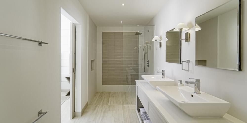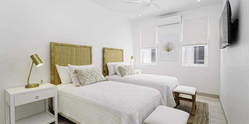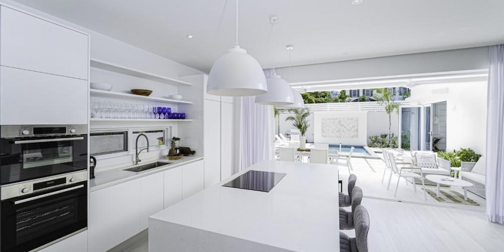 The open-plan interior is finished in a clean, contemporary palette with quartz countertops, premium appliances, and curated furnishings. Two of the three bedrooms feature en-suite bathrooms, while the third guest bedroom has access to a full bathroom directly adjacent. This has proven ideal for guests and also perfectly positioned to serve as a powder room when entertaining.
